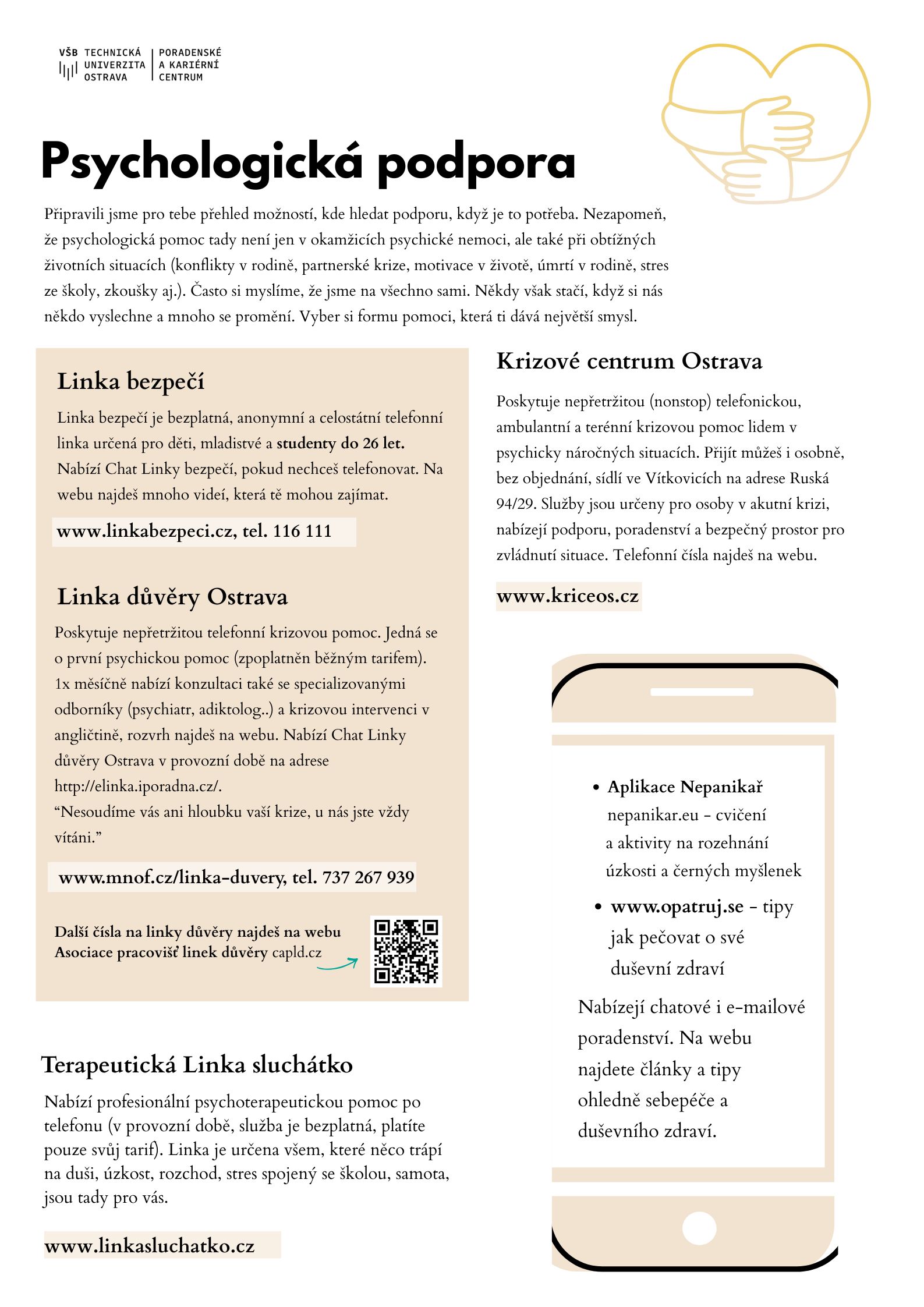 Na této stránce najdeš služby a aktivity, které tě v tom mohou podpořit – od poradenství s psychology a kouči, přes workshopy, až po relaxační aktivity s terapeutickými prvky jako třeba muzikoterapie. Vyber si to, co ti právě teď dává smysl.